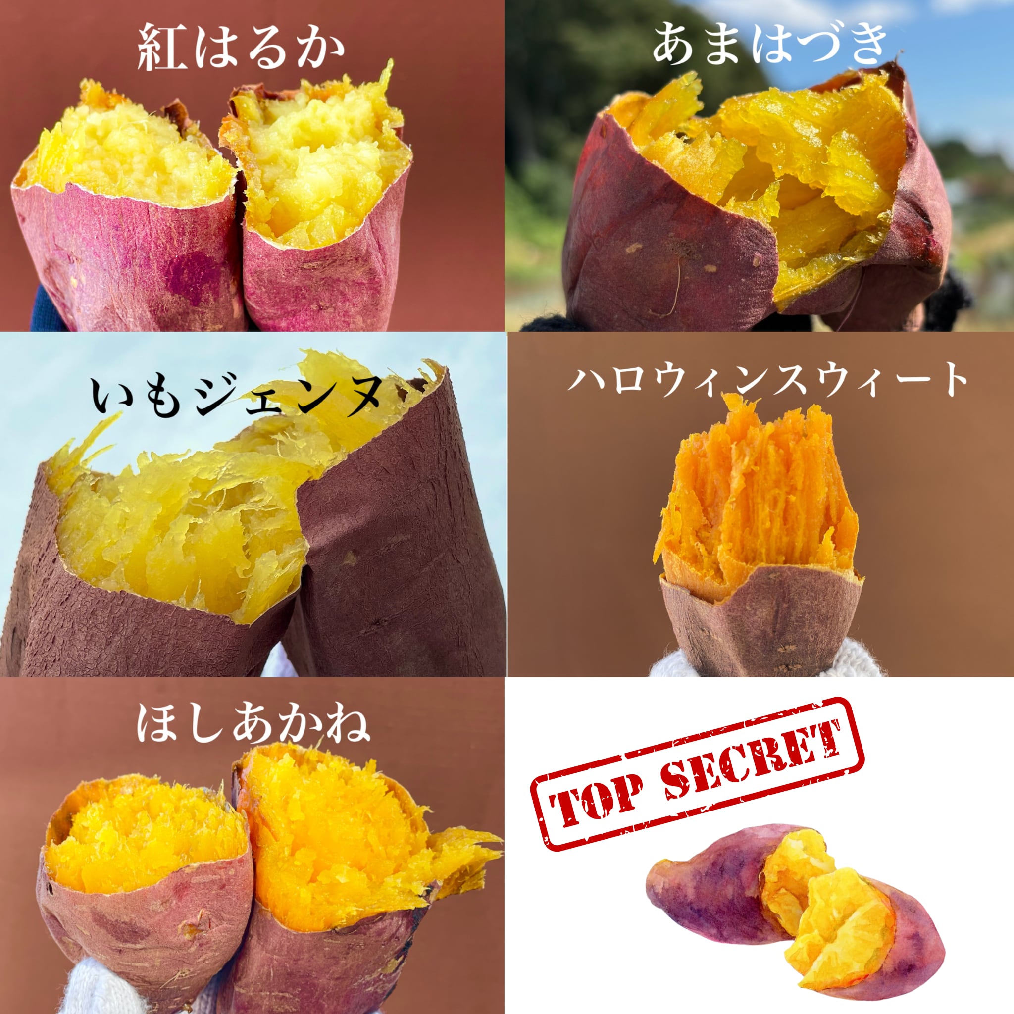 紅はるか1本、あまはづき1本、ほしあかね1本、ハロウィンスウィート1本、いもジェンヌ1本、シークレット2品種各1本
